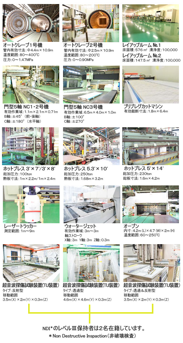 大型のオートクレーブや5軸NCマシニングセンタ、製品の内部欠陥を検出する非破壊検査装置も保有しており、これら設備が当社の複合材成形、ハニカム製品の加工を可能にしています。
